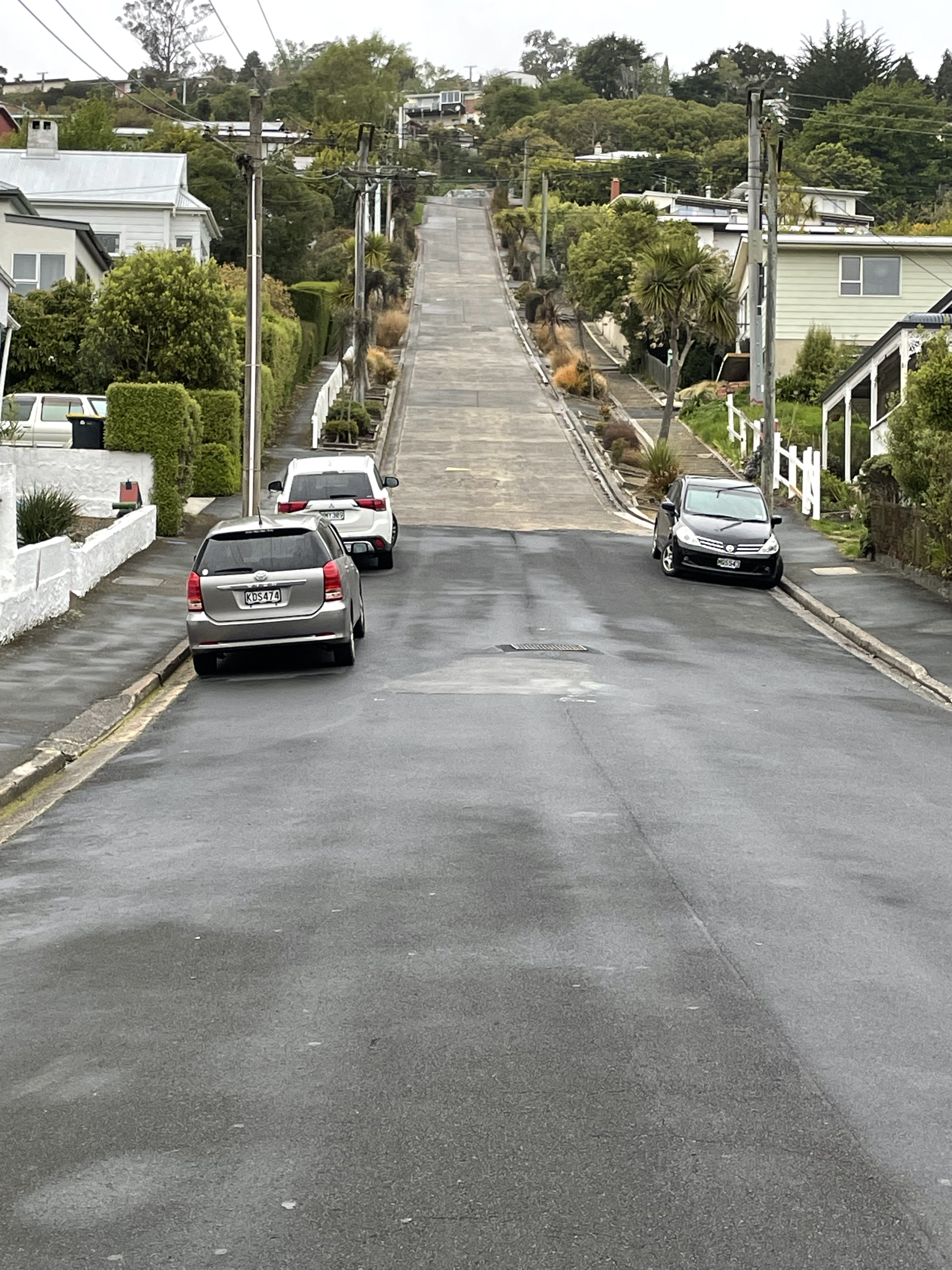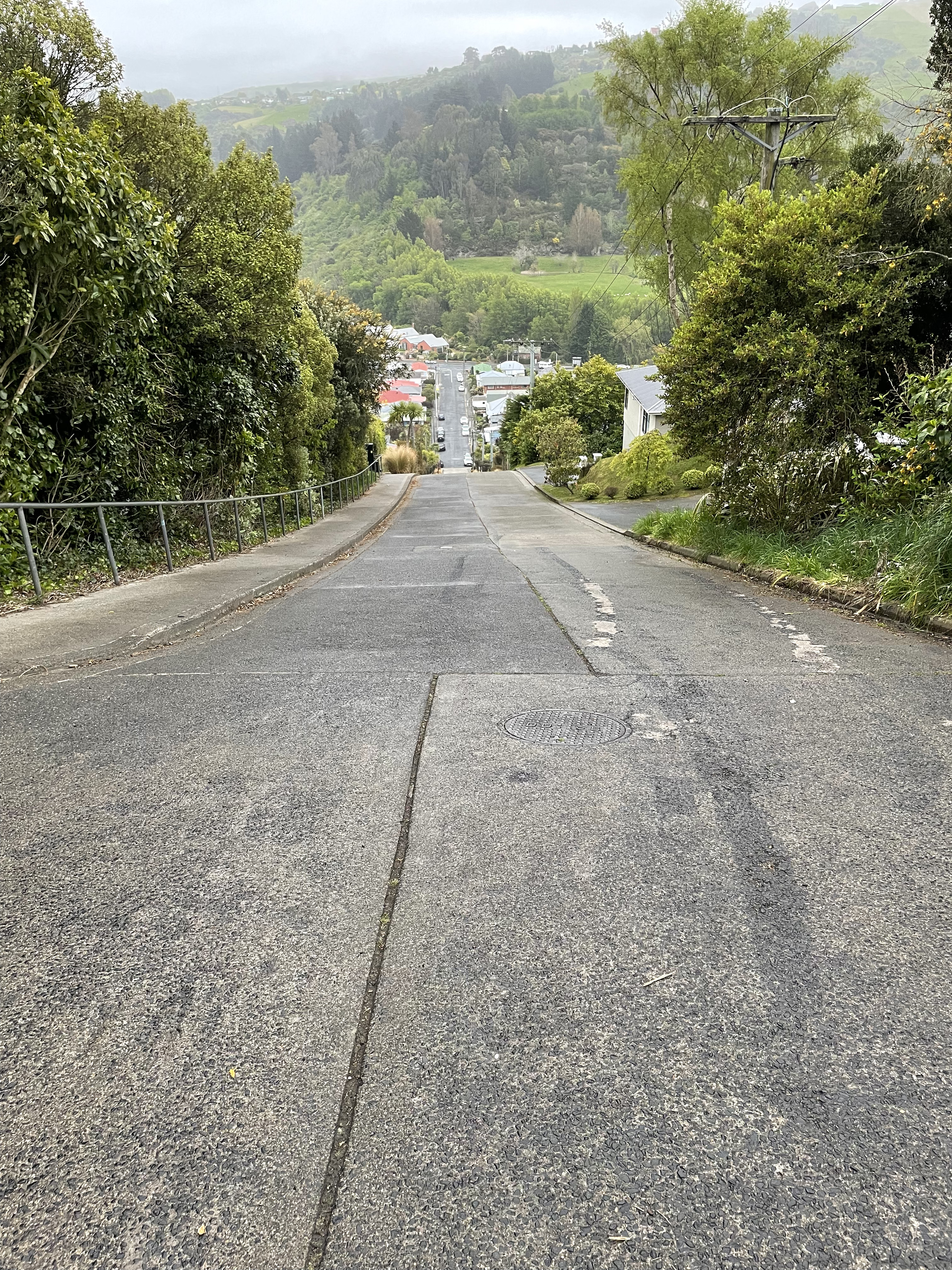 Bon, il a déjà été question des rues en pente de Dunedin. C’est sérieux ! On parle de record du monde. La rue Baldwin est la plus « pentue » au monde ! Guinness des records et photos à l’appui.