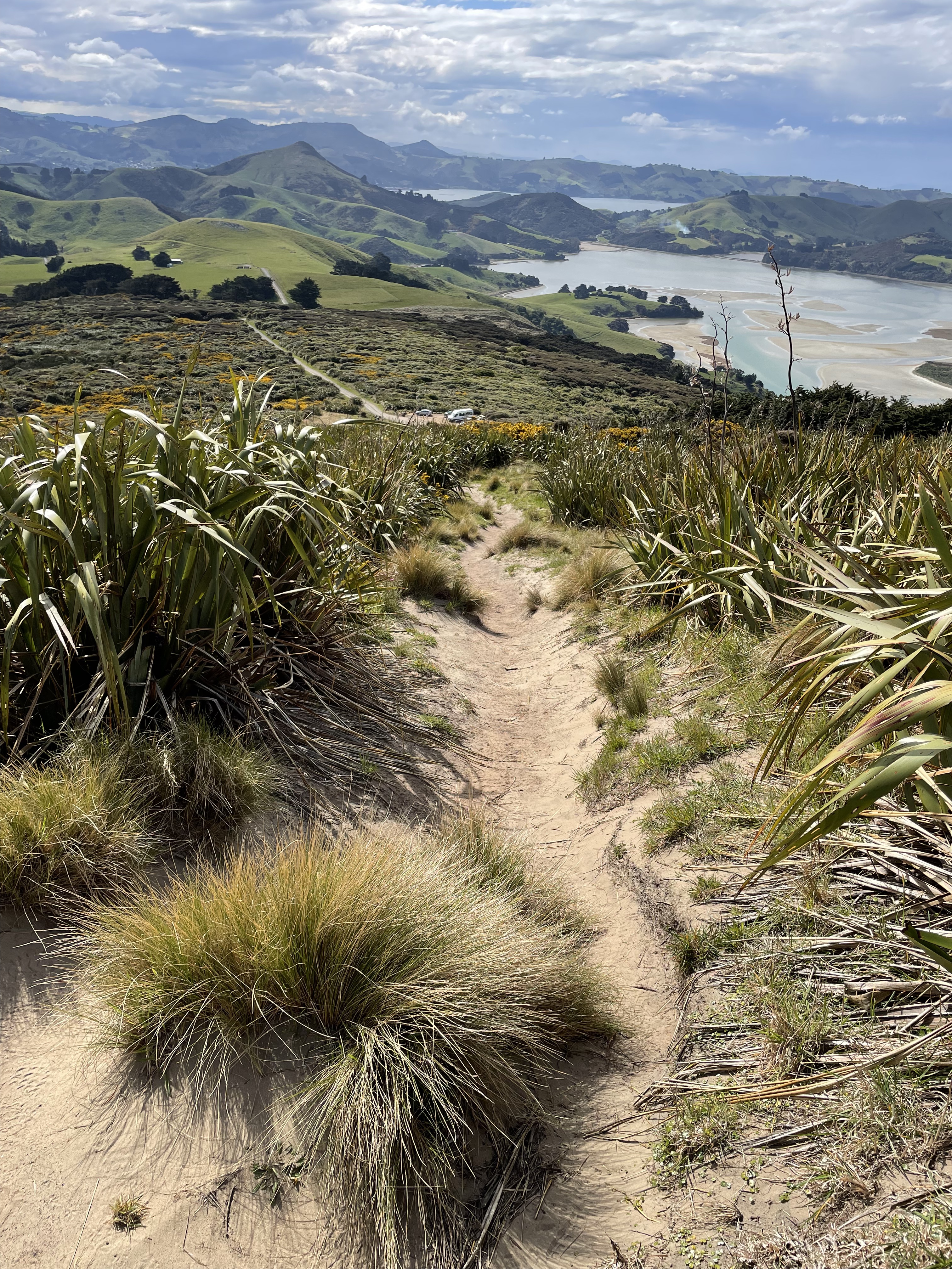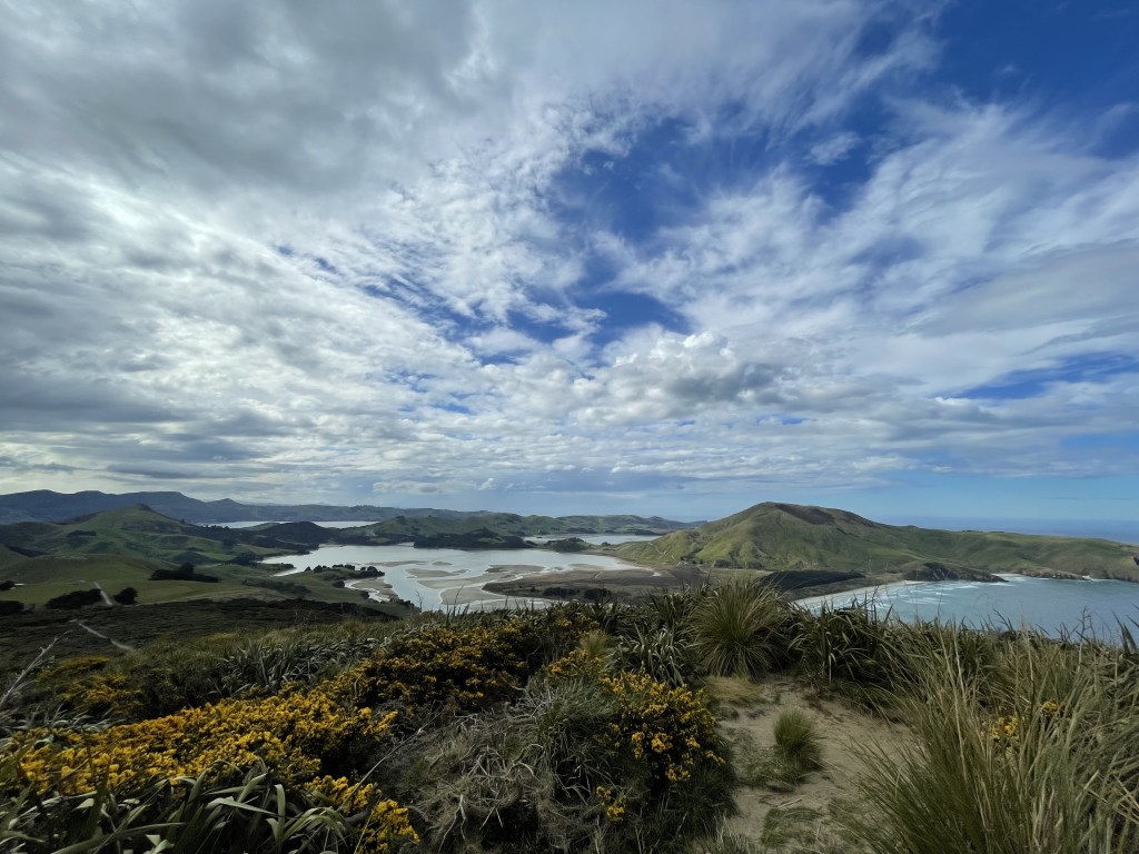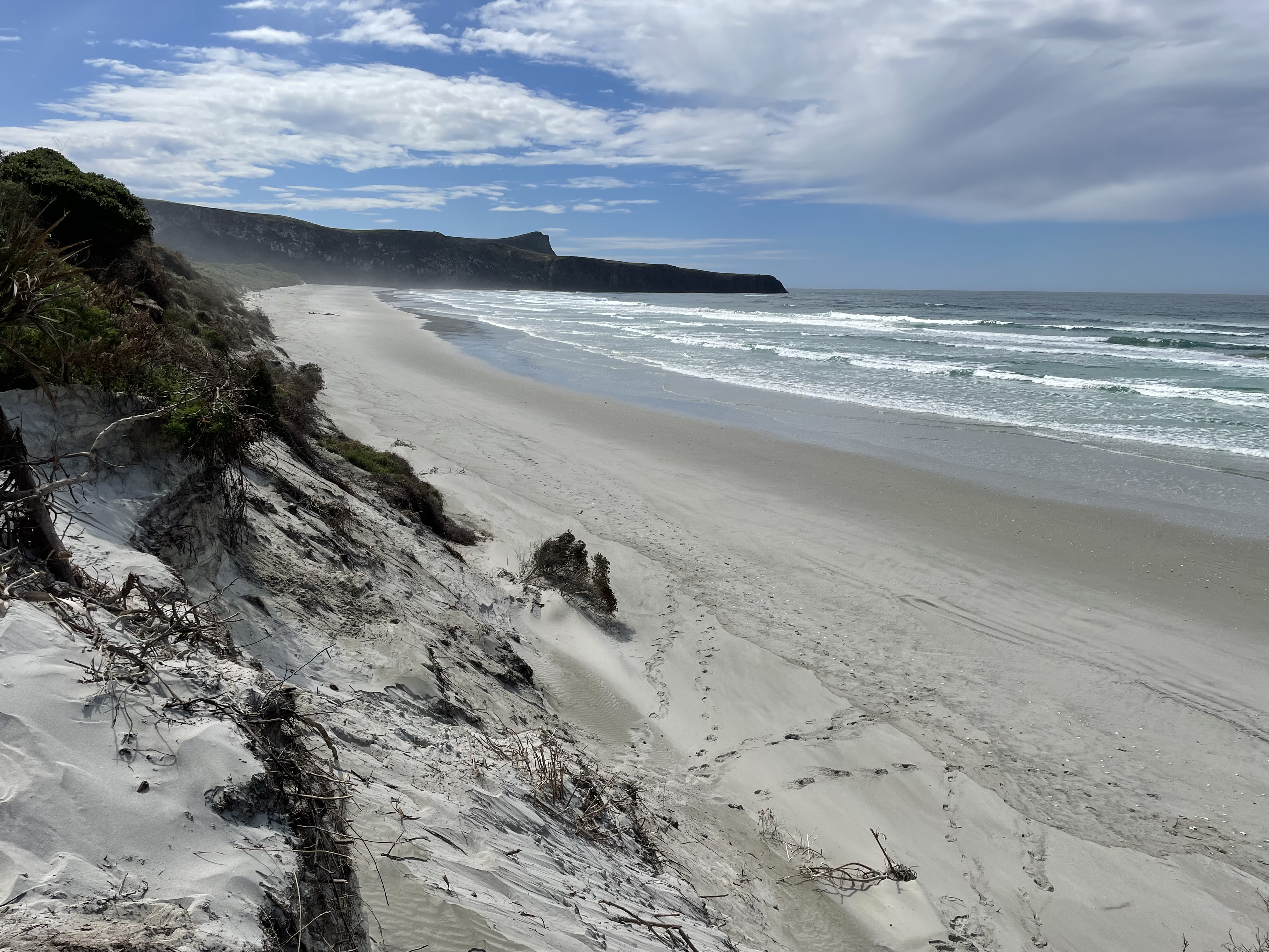 - Otago Peninsula : juste au sud de Dunedin, avec des plages désertes, habitat de l’albatros (qu’on n’a pas vu), du pingouin à oeil jaune (qu’on n’a pas vu non plus), des otaries à fourrure et des lions de mer (qu’on a vu.e.s)