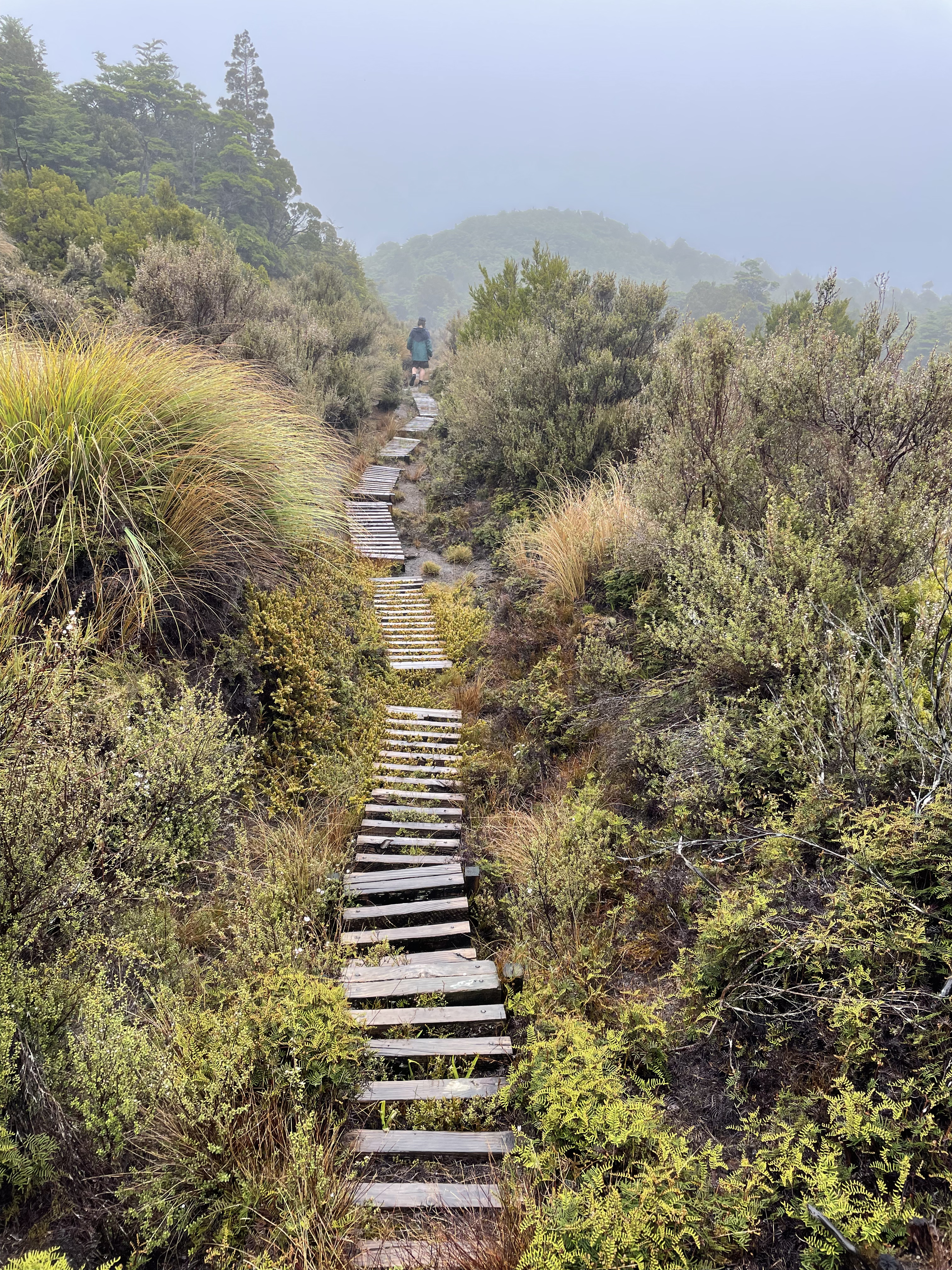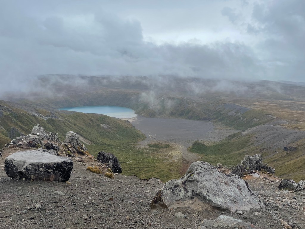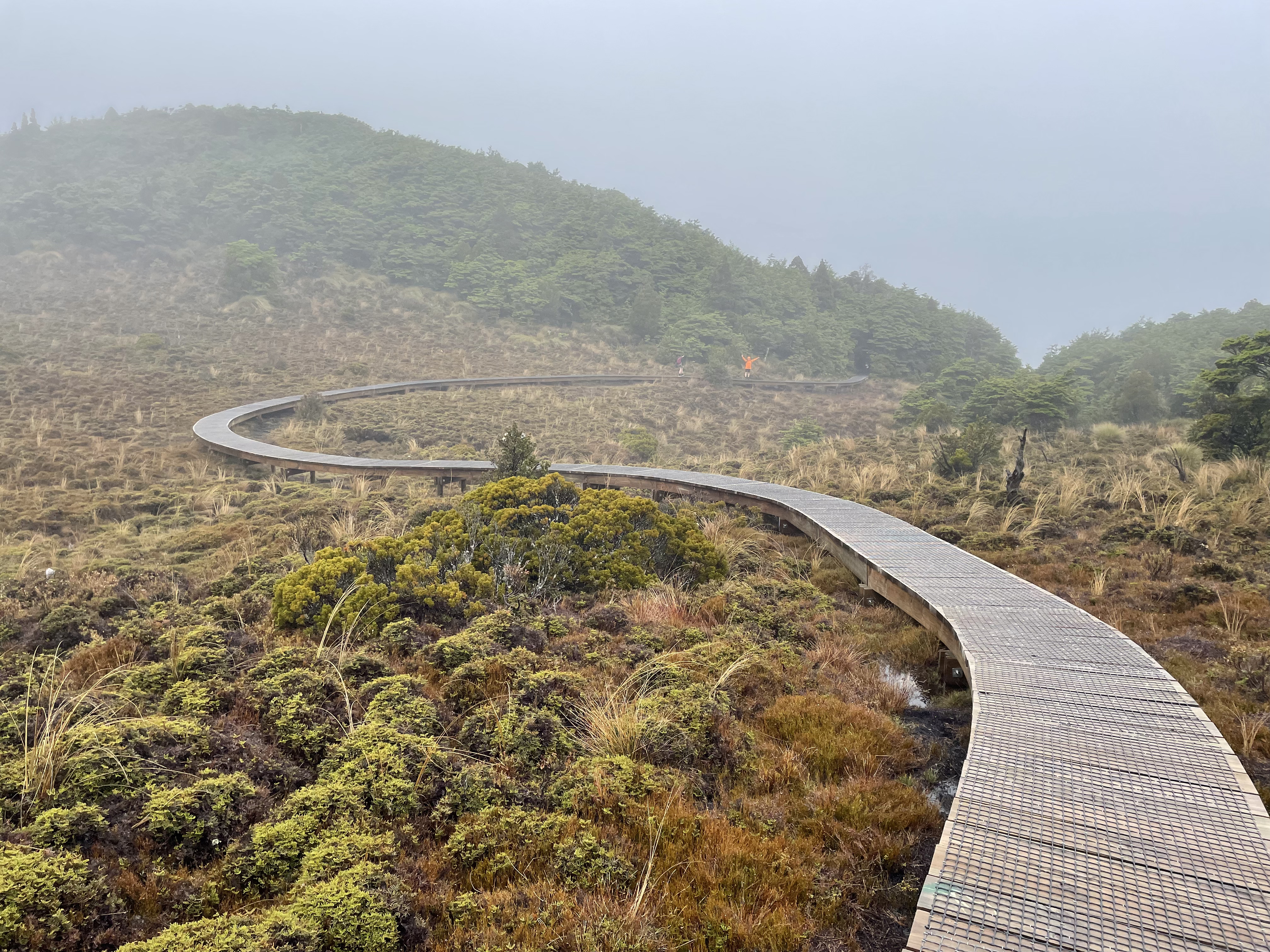 Parc national au centre de l’Île du Nord offrant la possibilité de voir trois magnifiques volcans. Voir ? Hum… pas vraiment. Car la météo alpine ne permet pas souvent de les voir, ces trois volcans. Notre plan de faire le Tongariro Northern Circuit, un parcours de 50 km en 3 jours et deux nuits sous la tente (car plus de place en refuge), est parti au vent (trop de vent) et tombé à l’eau (trop de pluie) et trop mauvaise visibilité. Impossible de s’y aventurer. Même la randonnée d’une journée, Tongariro Alpine Crossing, n’est pas recommandée.