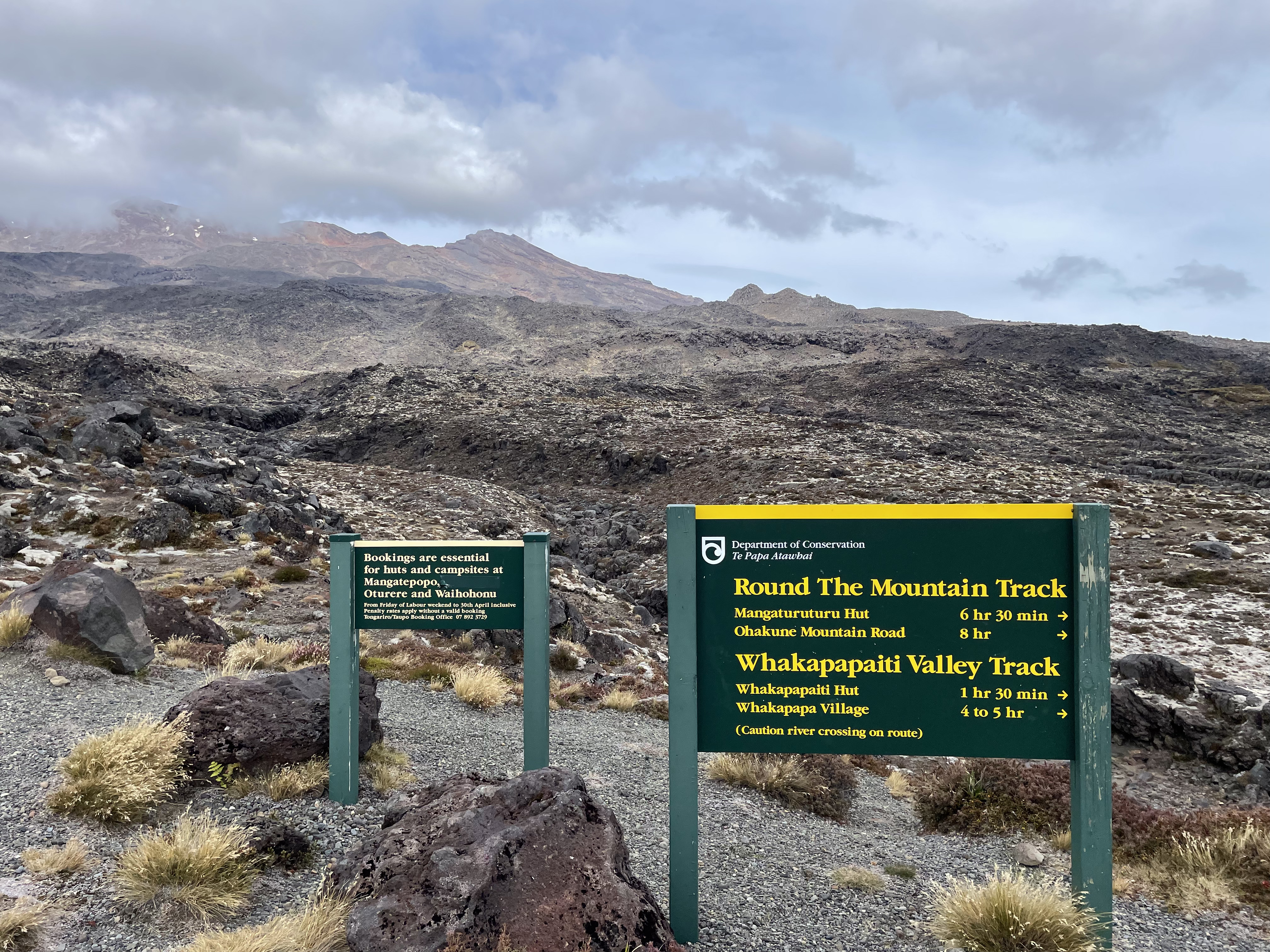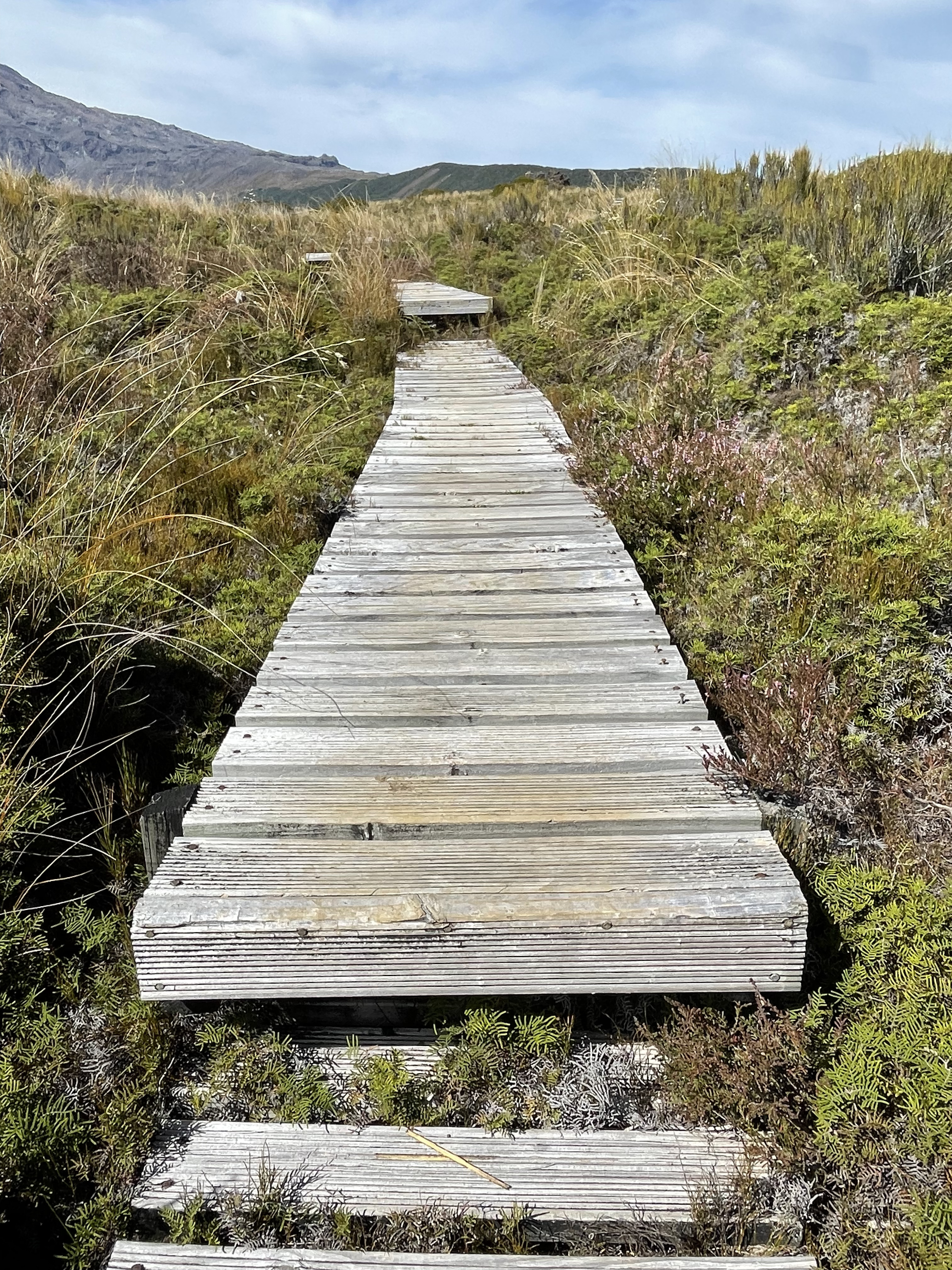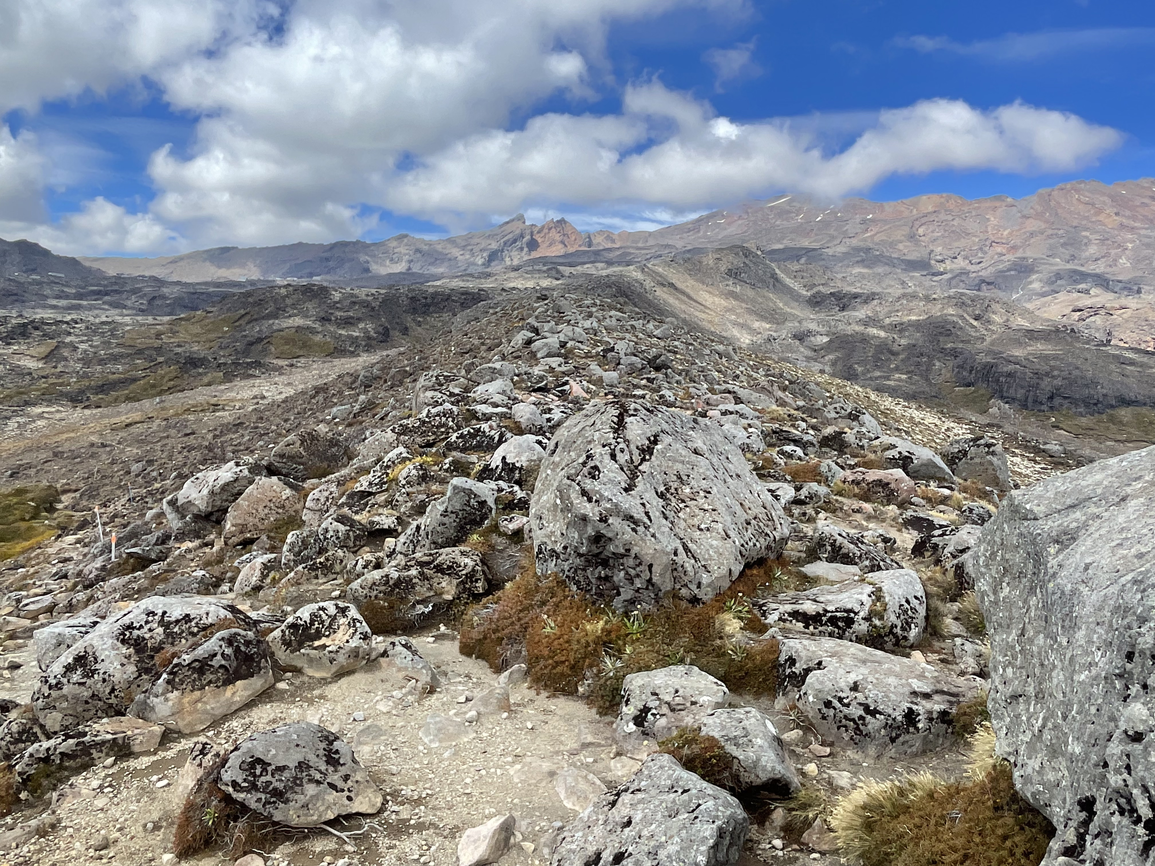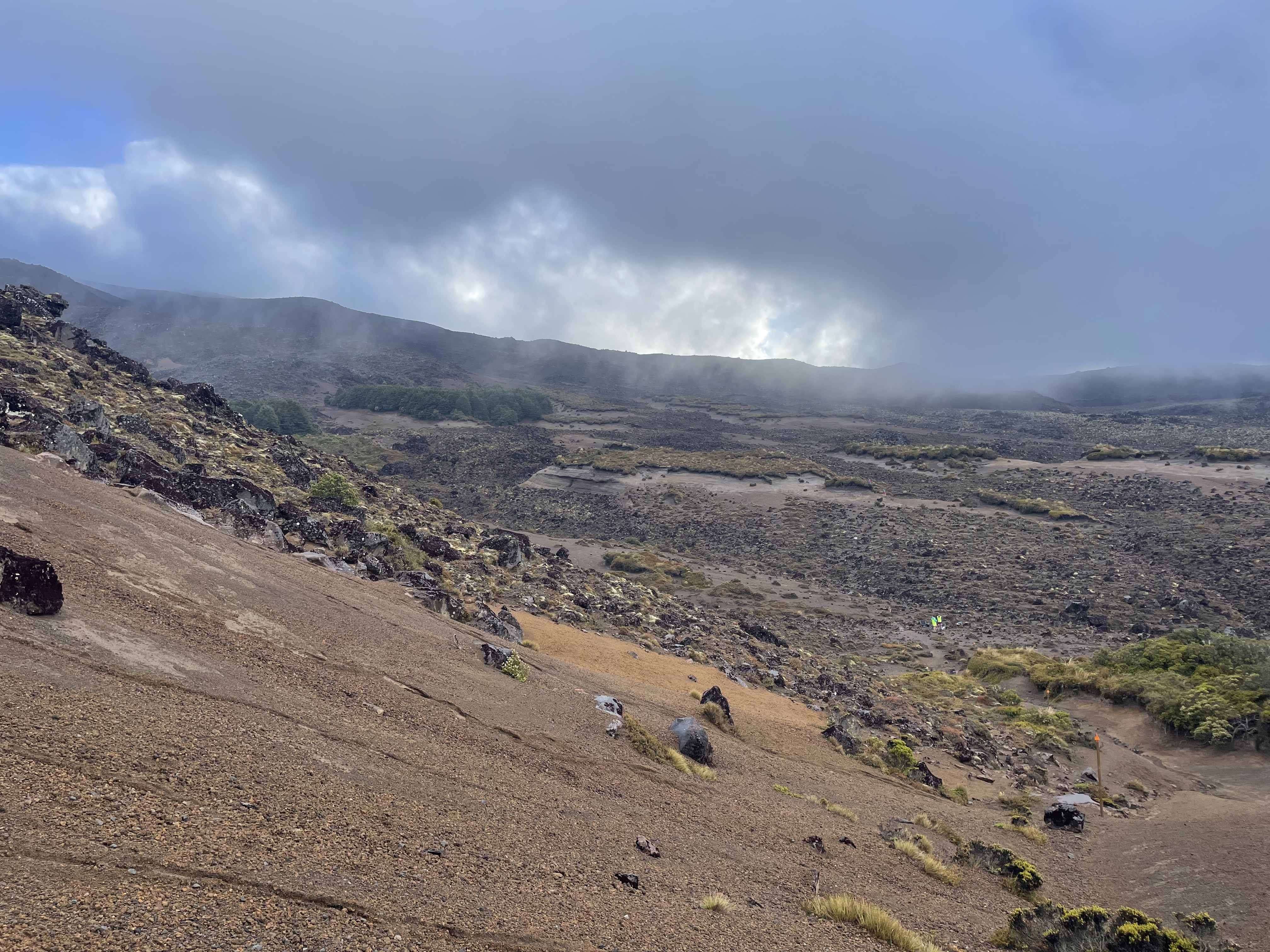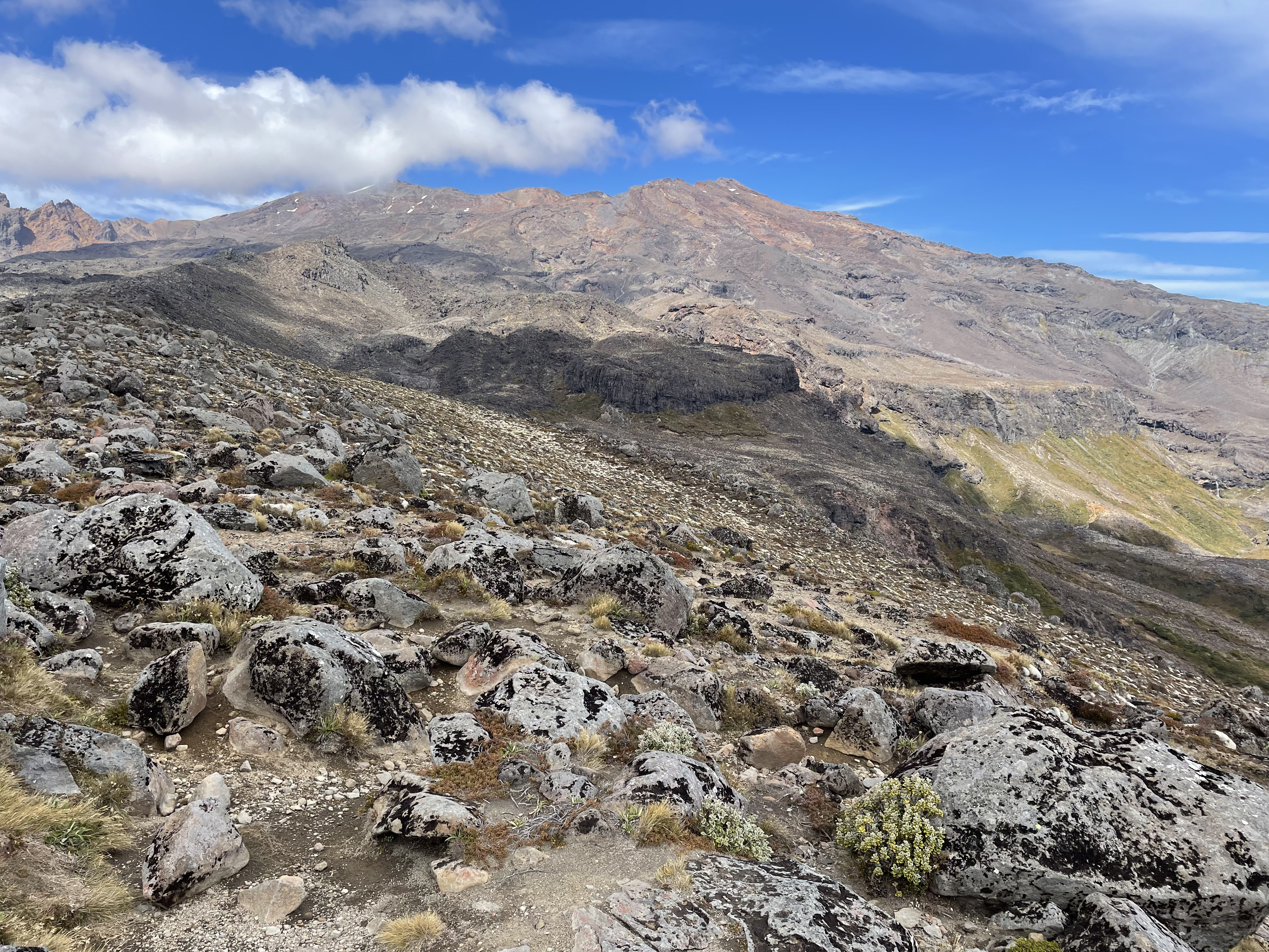 Au bout de la route, la station de ski Whakapapa qui n’est qu’une station de rochers et de cailloux en été. Quelques sentiers se faufilent dans ces dédales minéraux. Nous n’arriverons jamais au « Summit of Dome » pour cause de nuages se profilant à l’horizon et d’heure tardive pour aborder la dernière ascension dans les rochers vers le sommet (si c’était vraiment la dernière ascension car ces montagnes cachent souvent un autre sommet après chaque sommet !) mais vues à couper le souffle tout de même, avec toujours le volcan Tongariro en point de mire.