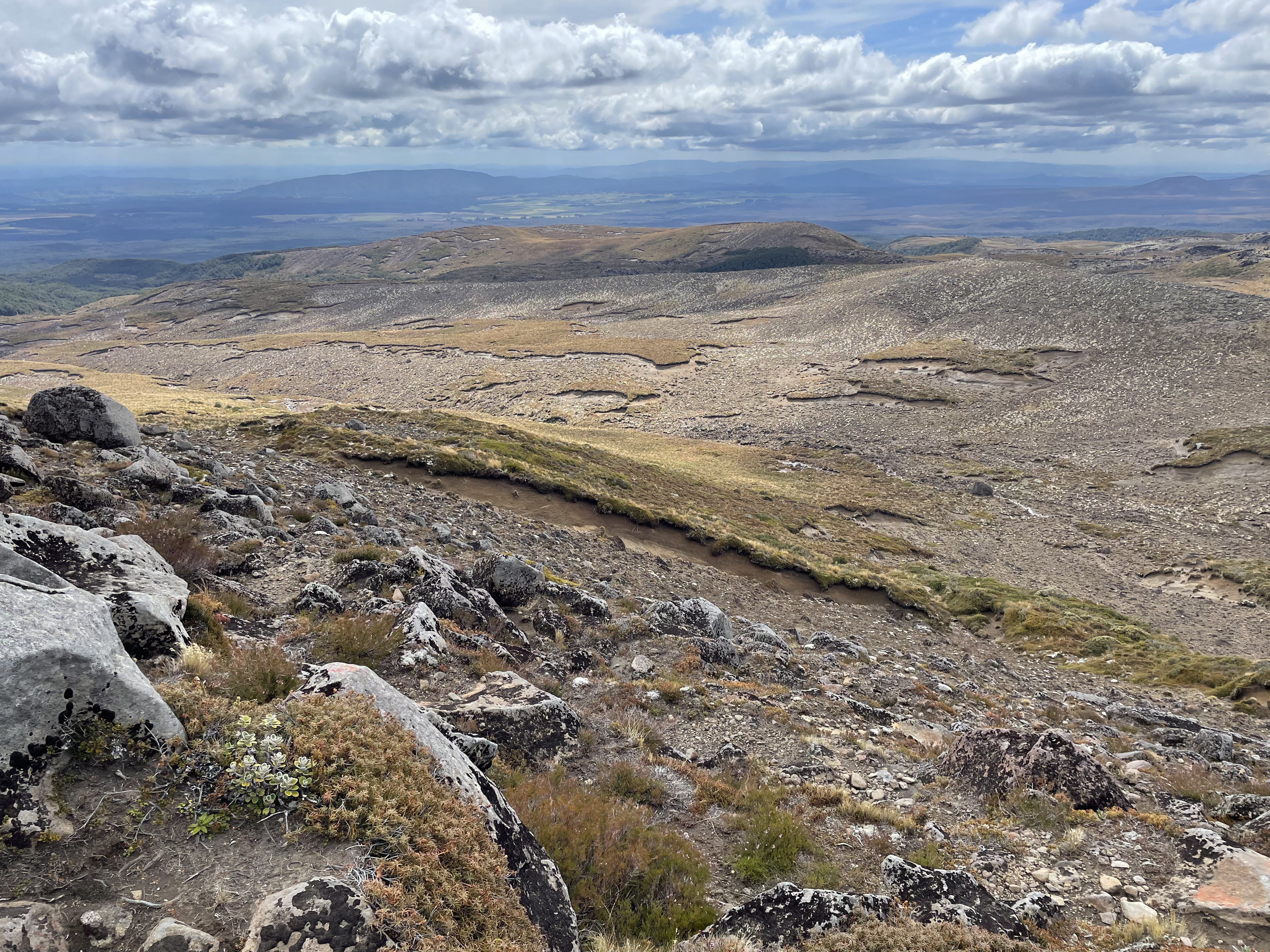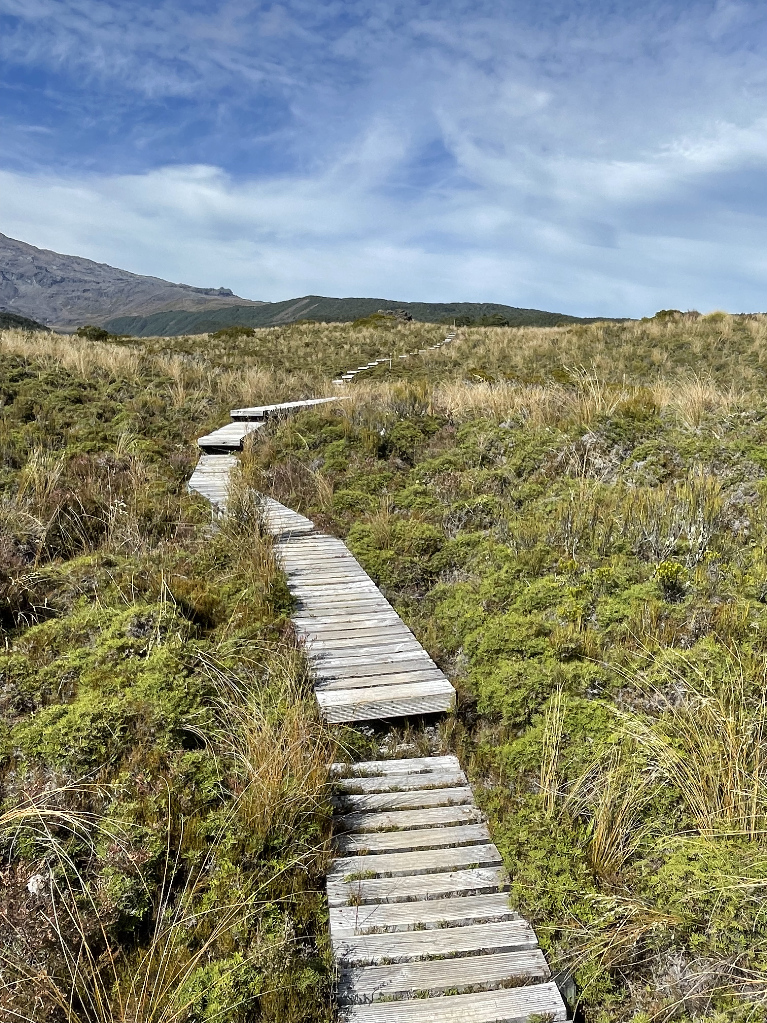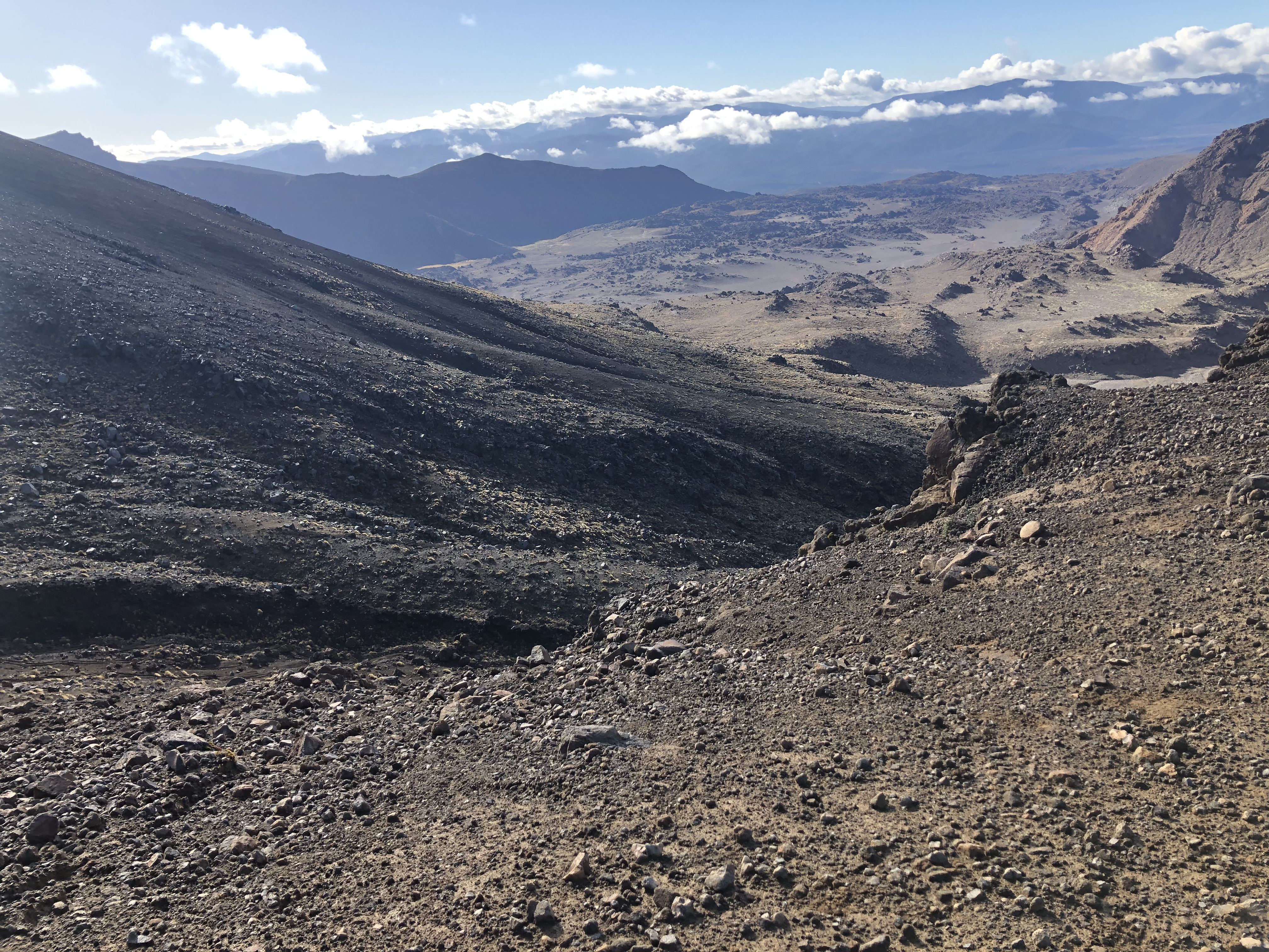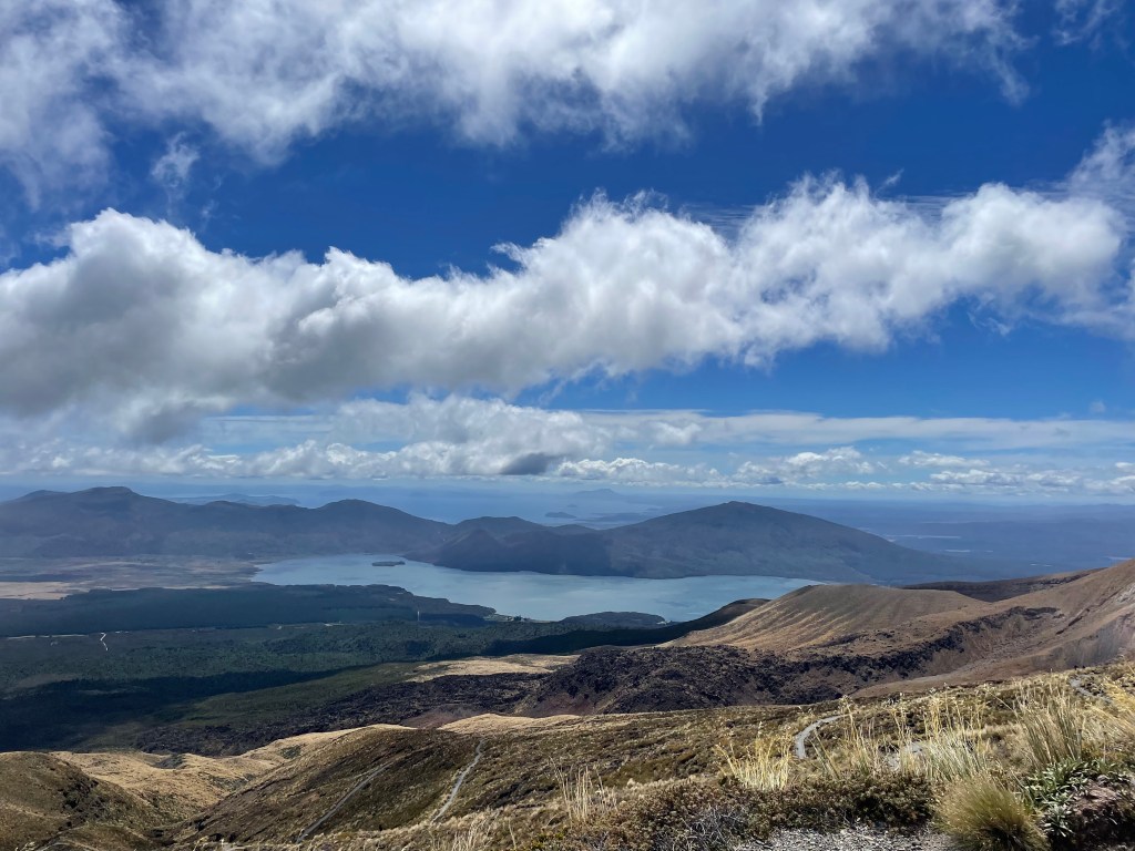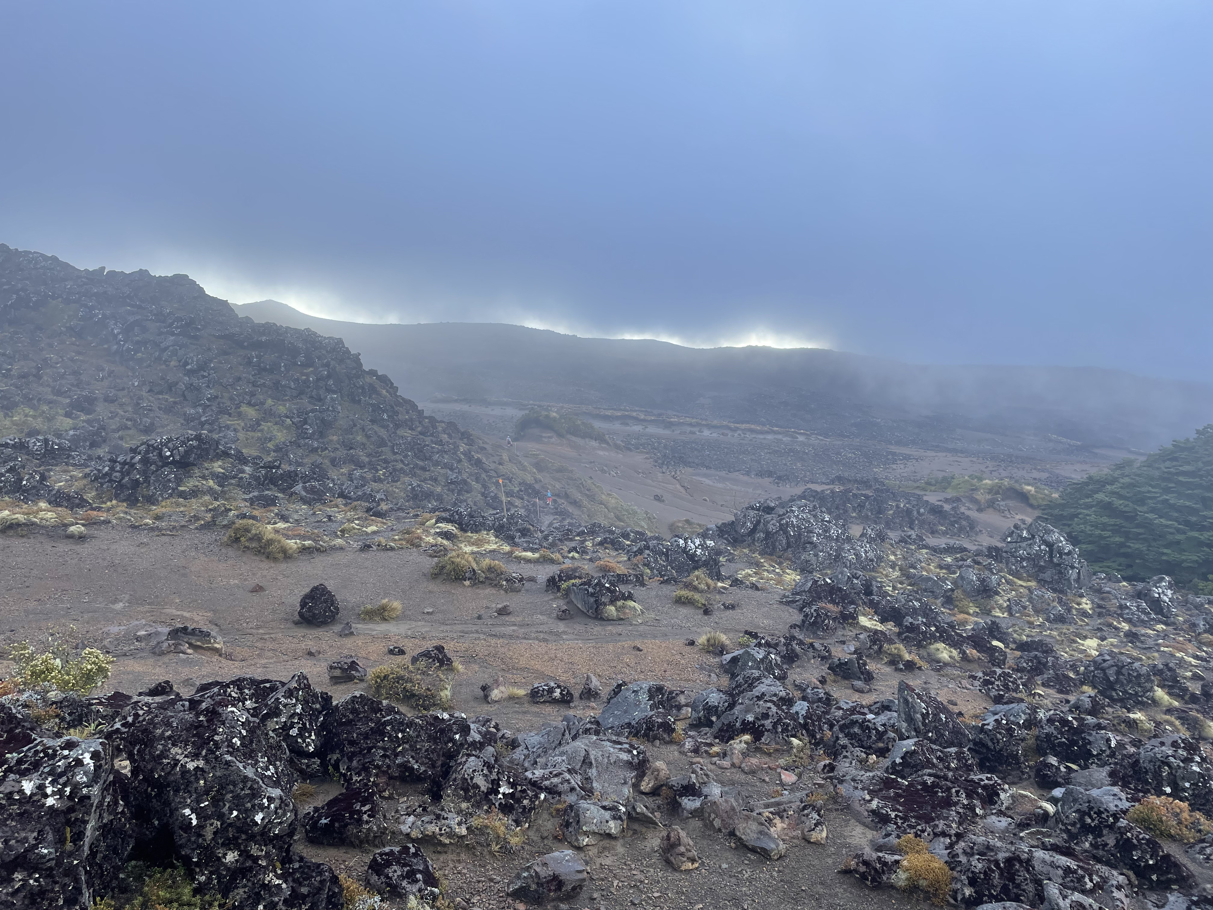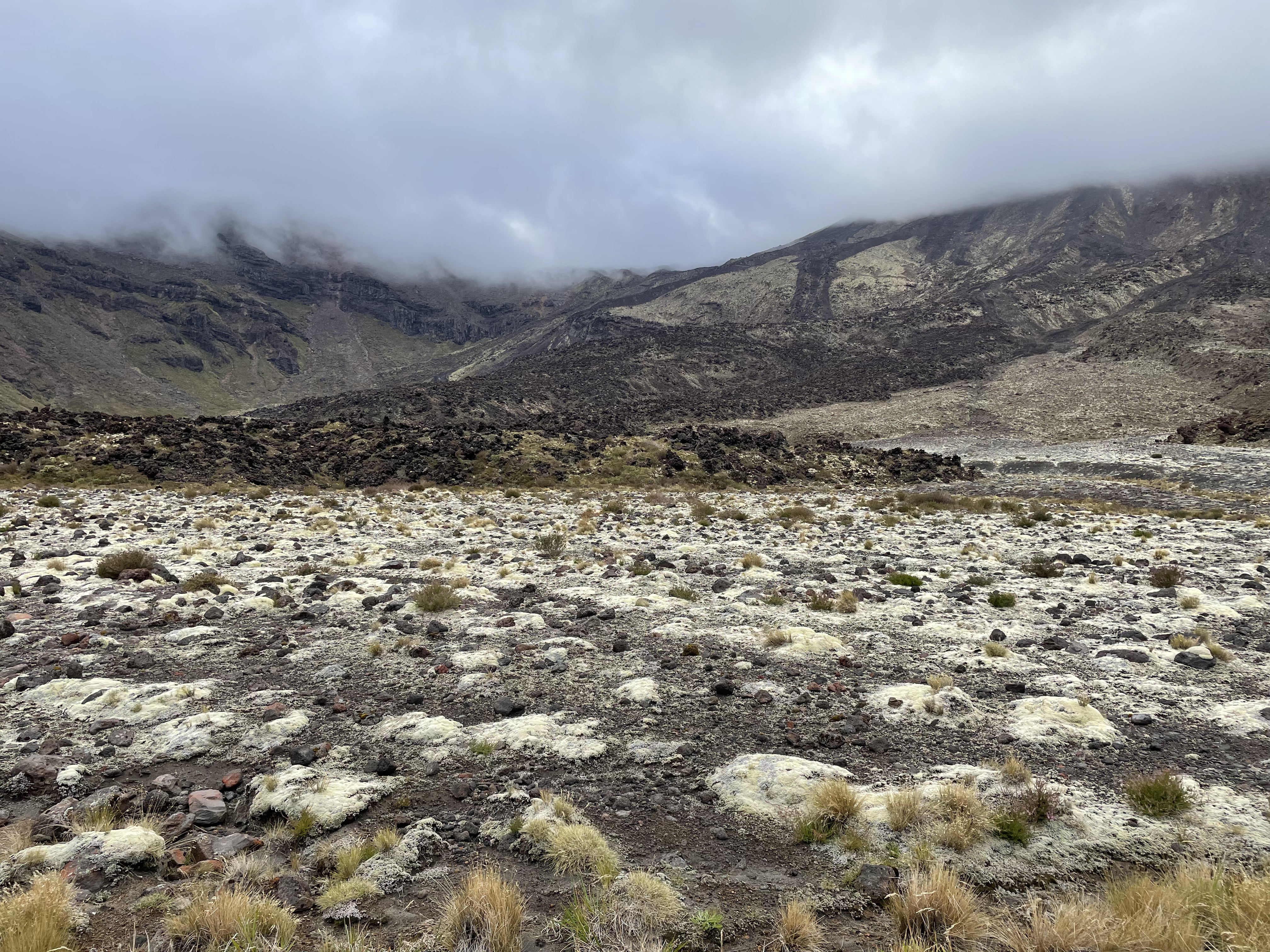 Au bout de la route, la station de ski Whakapapa qui n’est qu’une station de rochers et de cailloux en été. Quelques sentiers se faufilent dans ces dédales minéraux. Nous n’arriverons jamais au « Summit of Dome » pour cause de nuages se profilant à l’horizon et d’heure tardive pour aborder la dernière ascension dans les rochers vers le sommet (si c’était vraiment la dernière ascension car ces montagnes cachent souvent un autre sommet après chaque sommet !) mais vues à couper le souffle tout de même, avec toujours le volcan Tongariro en point de mire.